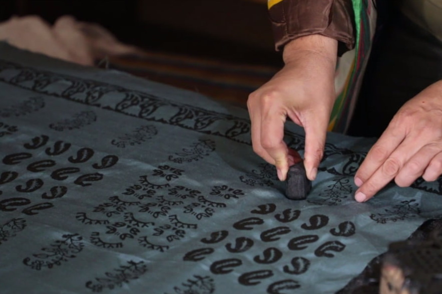 Бу ўша мармар тошга мато тайёр бўлгандан кейин тухумнинг оқини кўпиртириб, матога бериб, мана шу шиша билан ишқалаб пардоз берилган. Ҳозир қайси музейга борманг, Вашингтон тўқимачилик музейига борсангиз ёки Тошкентдаги музейга борсангиз, адрас матолари ярқираб турибди. Сабаби тухумнинг оқи берилиб, пардоз берилганлиги. Йиртмоқчи бўлсангиз ҳам у тўқимадан кетмайди, куч билан йиртишингиз мумкин. Ҳам пишиқ, ҳам табиий ранг, ҳам табиий ипакдан бўлган матоларимиз сирасига киради.