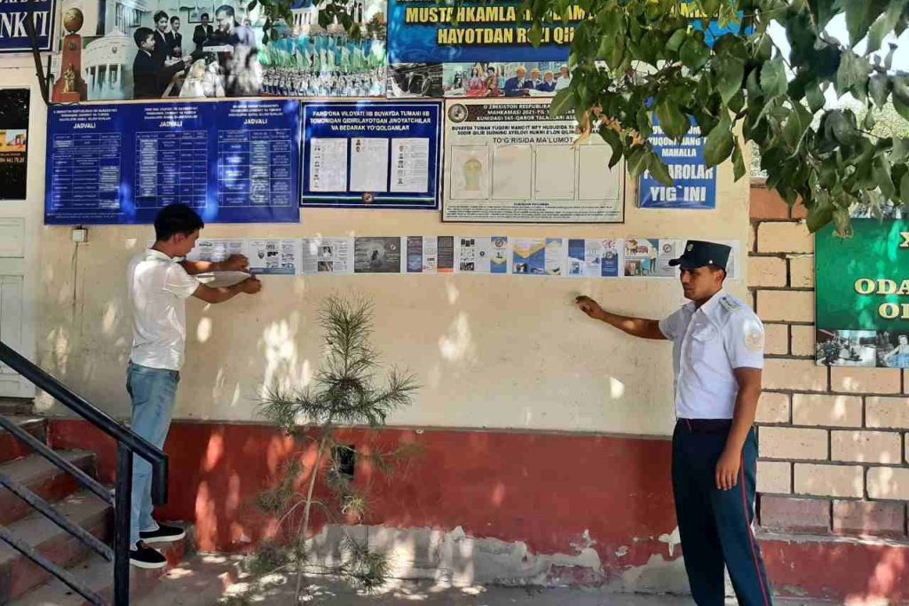 Бувайда тумани Юқори Манғит маҳалласида жиноятчилик ва ҳуқуқбузарликларнинг олдини олишга қаратилган тарғибот материаллари аҳоли гавжум жойларга тарқатилмоқда.